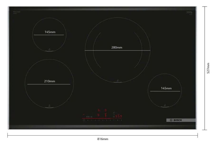 Kích thước vùng nấu 1 x 21.0 cm Ø, 1 x 28.0 cm Ø, 2 x 14.5 cm Ø