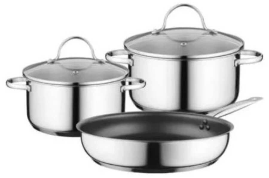 Bộ nồi Bosch HEZ9SE030 bao gồm 2 nồi Ø16/20cm và 1 chảo chống dính Ø26cm, có thể đáp ứng nhu cầu nấu nướng hàng ngày của gia đình. Chất liệu nồi inox sáng bóng, bền chắc, an toàn sức khoẻ, chống ăn mòn, chống gỉ sét và đặc biệt là đáy 3 lớp có thể dùng với mọi loại bếp, kể cả bếp từ. Chảo phủ chống dính bền bỉ, an toàn và dễ vệ sinh.